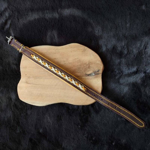 Voeg een vleugje kleur en elegantie toe aan de avonturen van uw hond met deze prachtige handgemaakte halsband, perfect ontworpen voor comfort en uitstraling.