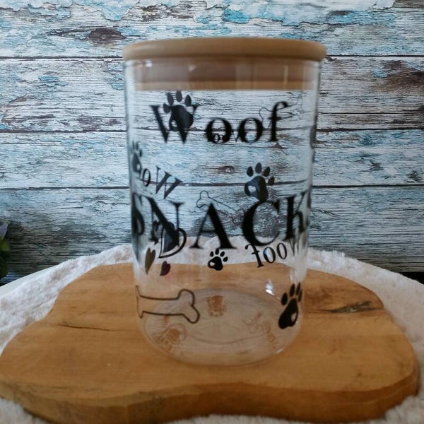 Deze stijlvolle glazen voorraadpot van 800 ml is perfect voor het opbergen van lekkere snacks voor onze viervoeters. De pot heeft een natuurlijke bamboe deksel met siliconen ring voor een goede afsluiting. Dankzij het woof design past deze pot in elke honden eigenaar keuken.