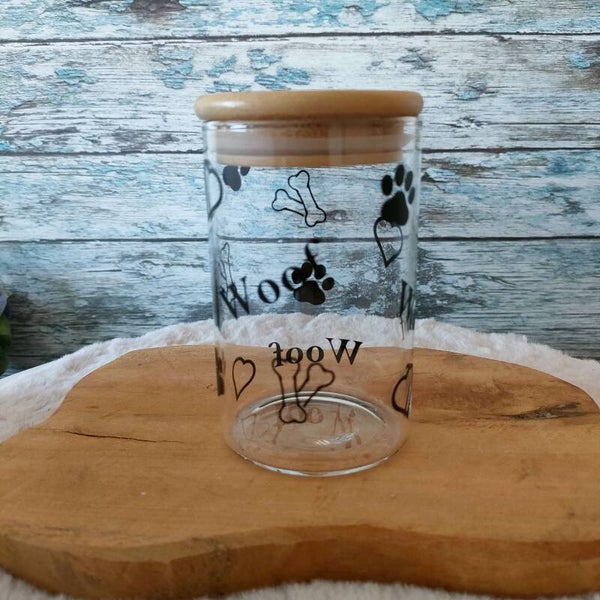 Deze stijlvolle glazen voorraadpot van 300 ml is perfect voor het opbergen van kleinere lekkere snackjes voor onze viervoeters. De pot heeft een natuurlijke bamboe deksel met siliconen ring voor een goede afsluiting. Dankzij het woof design past deze pot in elke honden eigenaar keuken.