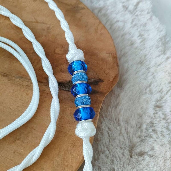 Subtiele details: de showlijn is afgewerkt met vijf acryl kralen: twee versierd met fonkelende strass steentjes en drie in een stijlvolle paarse kleur. Deze kralen zorgen niet alleen voor een elegante uitstraling, maar geven de lijn ook net genoeg gewicht, zodat deze altijd losjes hangt, precies zoals voorgeschreven tijdens hondenshows. Bij het handvat zit ook een kraal om de lijn een geheel te maken en een extra luxe en unieke uitstraling te geven.